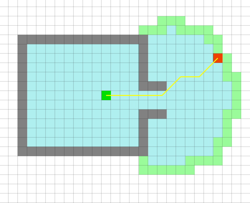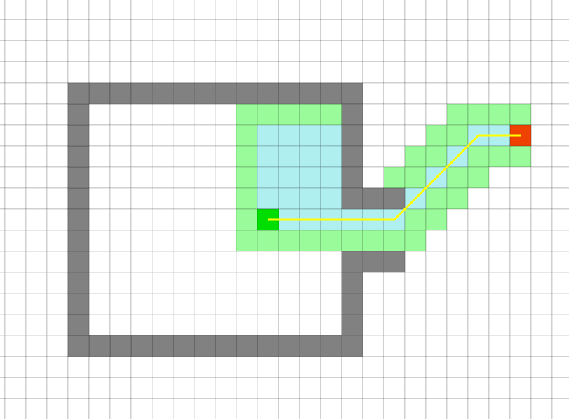 ↑A*算法在启发函数引导下,搜索区域更集中地朝向目标点扩展,而不是盲目扩散